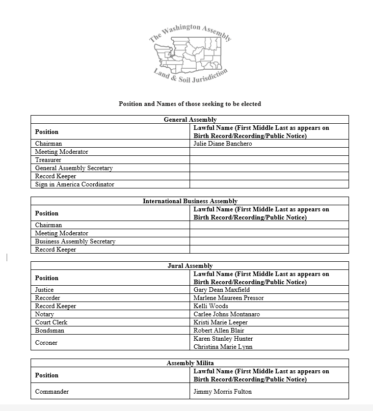 The Washington Assembly, having been called into session, is hereby giving notice of upcoming public elections to be held in 2025; a full list of Nominees, as well as the position and/or Office, said Nominees may occupy, are available here as if set forth in full: https://thewashingtonassembly.org/